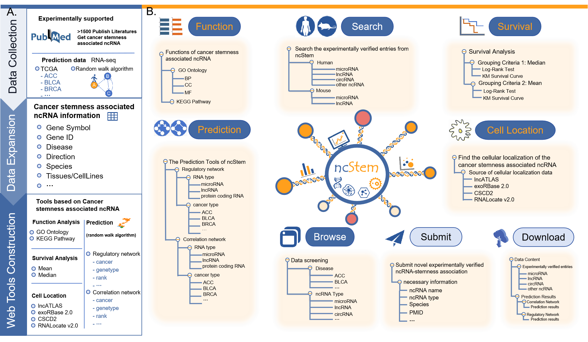 Furthermore, Function, Survival and Cell location tools are integrated in ncStem. Collectively, ncStem offers a user-friendly web server to search and predict ncRNAs in cancer stemness, which might facilitate research on cancer stemness and discover potential targets for cancer treatment.